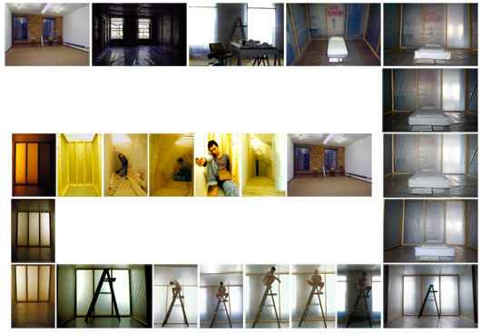 For my part of this "dialogue," I made drawings, wrote diary entries, and constructed layers of wooden frame covered with plastic stretch wrap. I did this everyday, building a total of 23 layers in Hsieh's studio even as I lived and slept there. When there was no more room in the place for further construction, I began to dismantle my work from the inside out.