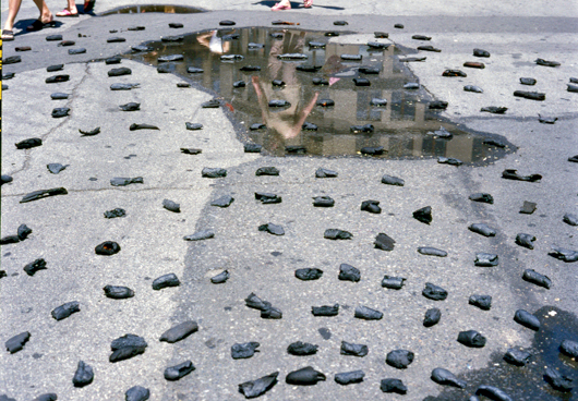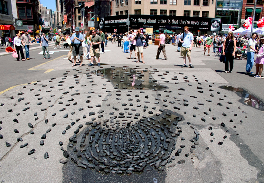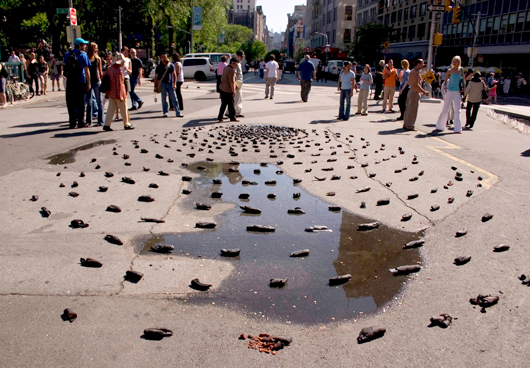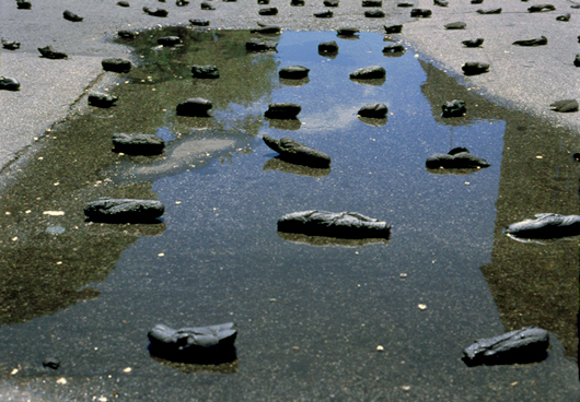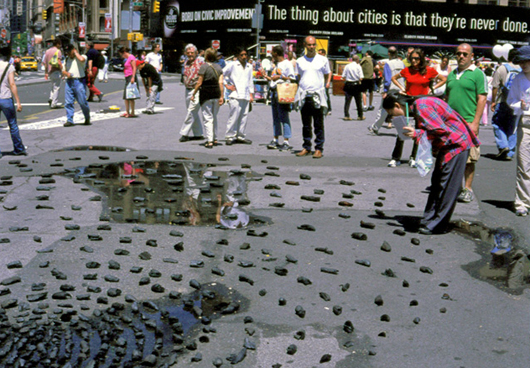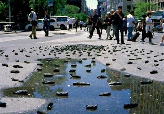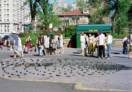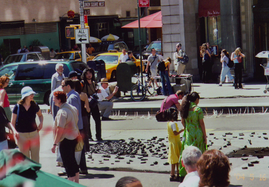 為響應一年一度在聯合廣場舉辦的慶祝「台灣週」活動。我以一個個不完整的碳焦黑包,在戶外裝置了這件作品,以碳焦黑包排列成同心圓形狀,並非取其宗教或儀式性,而較是參照所謂「指紋」的輪廓,指紋是辨識身份的客觀條件,卻也是進出美國的外國人必須留下的印記。這些碳焦黑包隨著活動進行,逐漸為行人壓碎而消失。