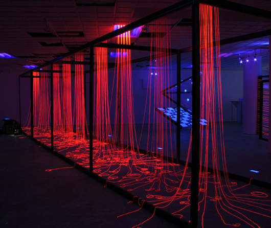 這是一件結合聲音、影像及複合媒材的裝置作品。「 框框相連到彼端 」作品衍生自協合公司所產製之鋁門窗。我運用門窗並試圖抽離其實用性。「門與窗」,簡易地說;就是個「框」,就是一種當你跨越它,將抵達另一處,或是從另一處到來的中介。以我偏好依空間而衍生創作動機之手法,藉由門窗框的使用,結合我平日慣用的一些媒材,諸如膠膜,影像等,並採用螢光燈,刻意營造出一個既非現實又非寫實的幻境。從個人意義來說,這件作品與我現階段居住的紐約有著某種情感關聯。